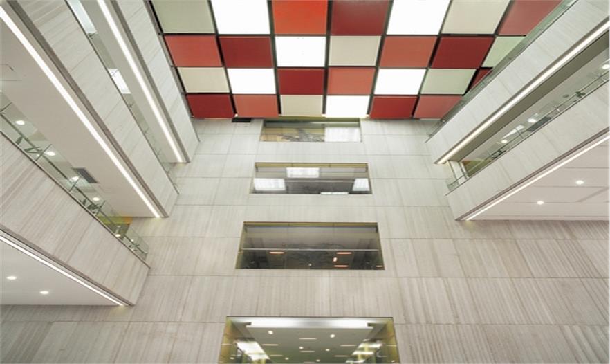報關大廳的頂部,利用了條狀彩色鋁板的特點,形成了平面化的pattern。在組織色彩的時候,米色、白色、棕色為辦公室空間注入了溫暖的情緒。