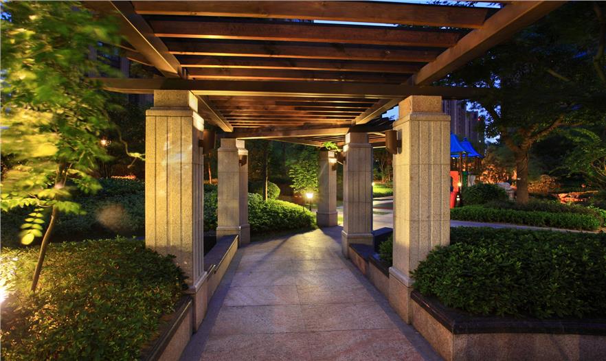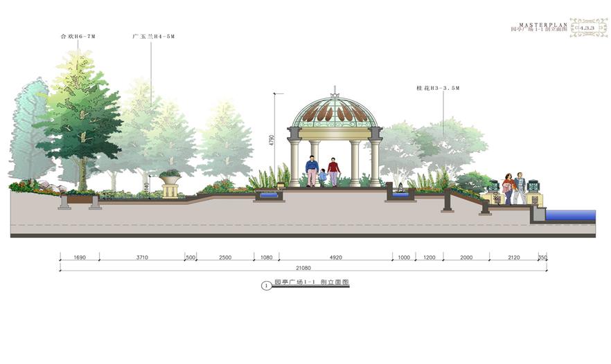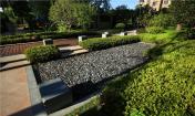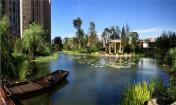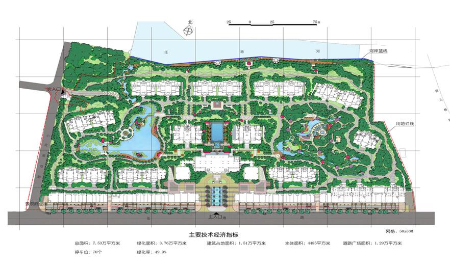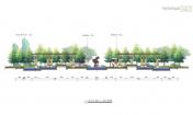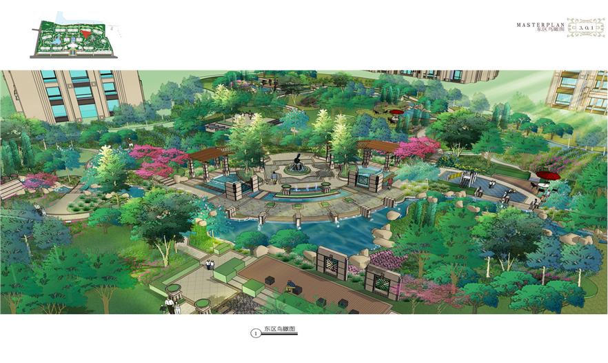 亮點:整體設(shè)計以綠為主,大量的、有層次的綠化來營造舒適的人居環(huán)境。東區(qū),將喧鬧的活動場地安置在庭園的中部,各類型活動場地沿水溪逐漸展開,形成親新宜人的親水環(huán)境。西區(qū),利用寬闊的庭園空間打造開闊的大水面,沿水岸東南側(cè)建造一條木棧道,形成開敞的視線空間,為居民提供精致舒適的親水休閑活動空間。
