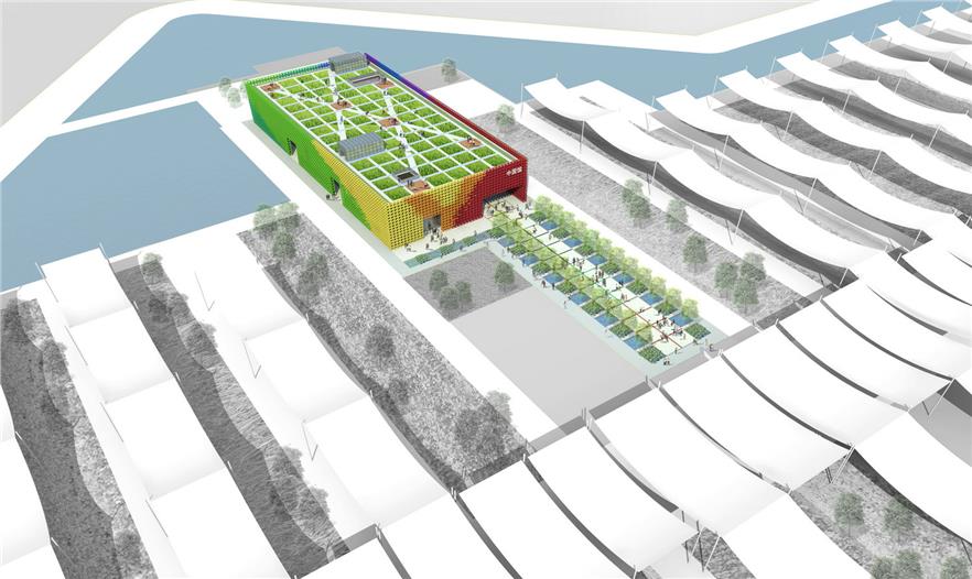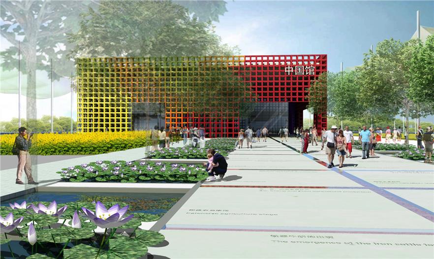 項目特點:結合中國館的主題“希望的田野,生命的源泉”,我們提取“田”字作為場地思考的出發(fā)點,并運用于整體場地設計之中,用5*5的模數(shù)對場地進行劃分,形成田園肌理,給場地鋪下以農(nóng)業(yè)為主題的大基調。在規(guī)劃好的“田園”中,植入?;~塘、超級水稻兩個元素來打造整體的景觀氛圍,同時也體現(xiàn)了中國農(nóng)業(yè)古老的智慧與現(xiàn)代農(nóng)業(yè)的創(chuàng)新。建筑立面的設計靈感來自于春天田園中開放的各色菜花,在陽光照射下所呈現(xiàn)出的豐富色彩。