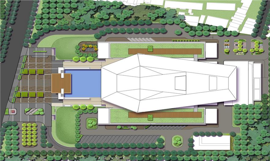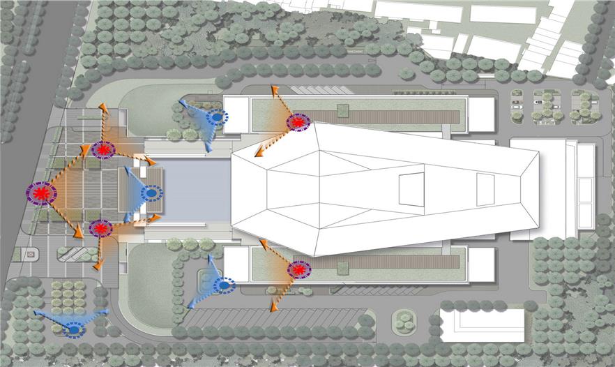 設(shè)計策略是在景觀設(shè)計里融合建筑的性格?;旌虾椭C和統(tǒng)一,讓中心(建筑)更加強(qiáng)烈,同時建筑性格更加清晰明了。通過平衡引力和特質(zhì),創(chuàng)造一個與建筑主入口中心軸線平衡的景觀設(shè)計。
