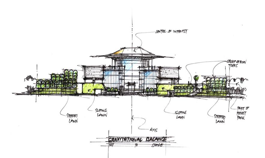 通過在景觀設(shè)計中使用相互均衡的手法,來強(qiáng)調(diào)軸線中間的景觀節(jié)點。