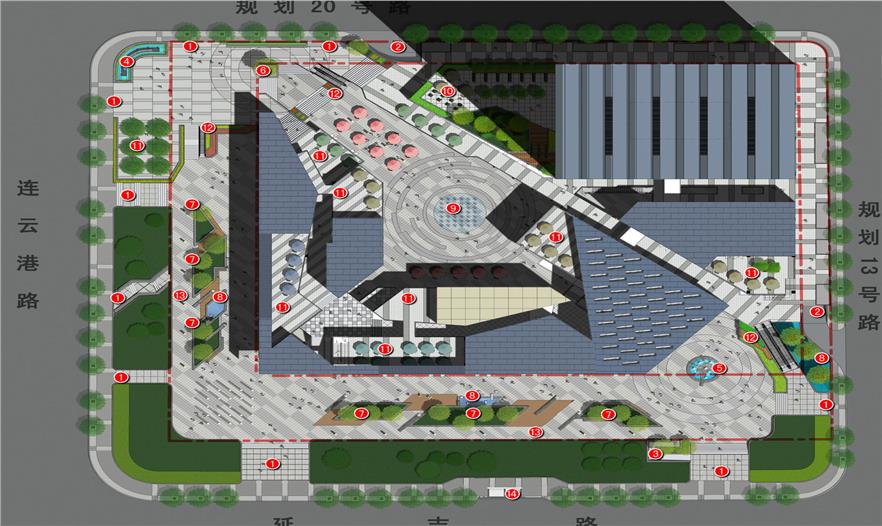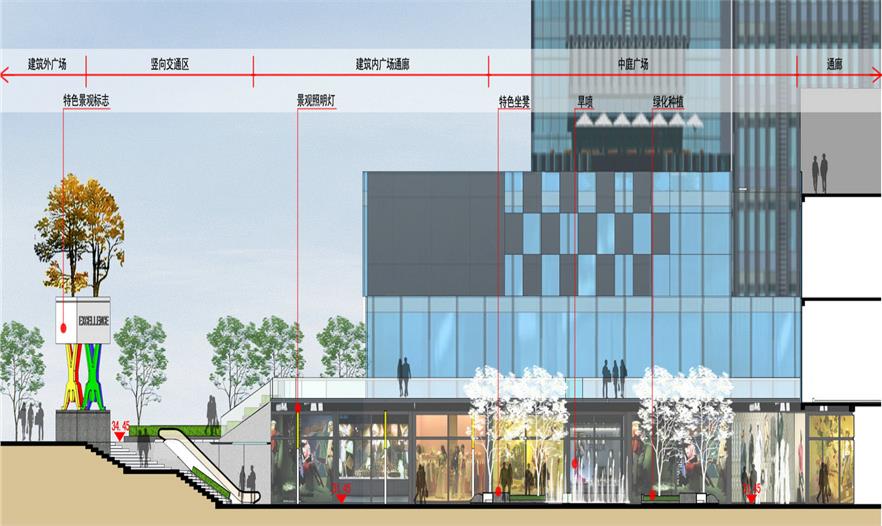基地豎向條件豐富多變,給景觀設(shè)計(jì)提供了豐富的創(chuàng)作空間,三層裙樓由諸多豎向交通流線(xiàn)組織,建筑外廣場(chǎng)由出入口直接與露天的中庭廣場(chǎng)相連。作為同處于CBD核心的卓越大廈和萬(wàn)達(dá)廣場(chǎng),兩個(gè)項(xiàng)目之間僅一條連云港路相隔,萬(wàn)達(dá)廣場(chǎng)在景觀的營(yíng)造上因自身地塊和活動(dòng)空間較大的特色,主要以大面積的硬質(zhì)鋪裝為主,但對(duì)綠化和標(biāo)志性構(gòu)筑物的強(qiáng)調(diào)較少,個(gè)性化表現(xiàn)相對(duì)弱。