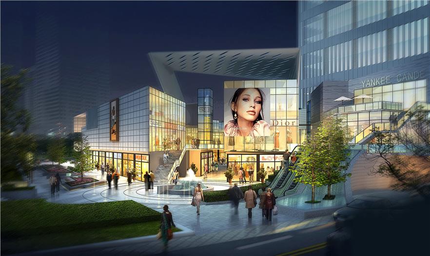 商業(yè)空間設(shè)計(jì)主要分為三個(gè)層次:底層商業(yè)廣場(chǎng)、二層走廊和屋頂花園。