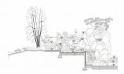 為了更充分地利用空間,在休閑平臺的的下方做了一個架空層,作為一個小型的會所和設(shè)備間。瀑布從架空的前方垂掛而下形成了一條水幕,給架空層添了一道朦朧的屏風(fēng);從外面看去會所就像水簾洞一般夢幻。