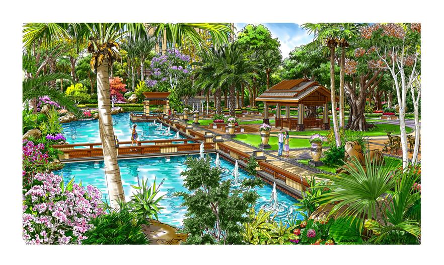 本項(xiàng)目結(jié)合地域特點(diǎn)與建筑設(shè)計(jì)風(fēng)格,以休閑度假式的現(xiàn)代東南亞風(fēng)格為藍(lán)本,以現(xiàn)代簡(jiǎn)潔的線條,干凈明快的表現(xiàn)手法,運(yùn)用現(xiàn)代東南亞視覺(jué)元素賦予環(huán)境景觀親切、宜人的藝術(shù)感召力,并巧妙的融合建筑新古典主義風(fēng)格的精髓,在不經(jīng)意的混搭中體現(xiàn)大氣、浪漫的尊貴情懷,體現(xiàn)自然景觀的莊重與時(shí)代感!通過(guò)自然曲線和幾何直線的主園路組合,形成層次豐富、序列清晰、張弛有度的景觀空間,強(qiáng)調(diào)空間的韻律節(jié)奏,注重在不同空間場(chǎng)所中的心理體驗(yàn)與感受的變化,從密林小徑到林中空地,疏林草地再到緩坡草坪,形成疏密、明暗、動(dòng)靜對(duì)比,并充分利用光影、等自然因素創(chuàng)造出富有活力的多元化感悟空間。