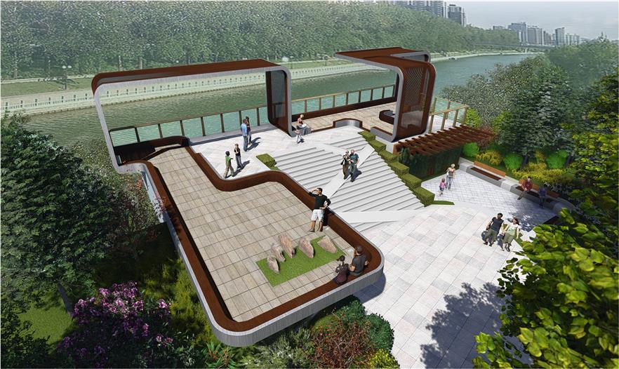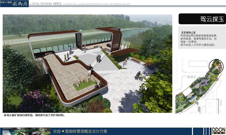 駕云探玉:利用場地周邊稀缺資源堆高造景;使用借景、框景等景觀手法,創(chuàng)造唯一性景觀;
