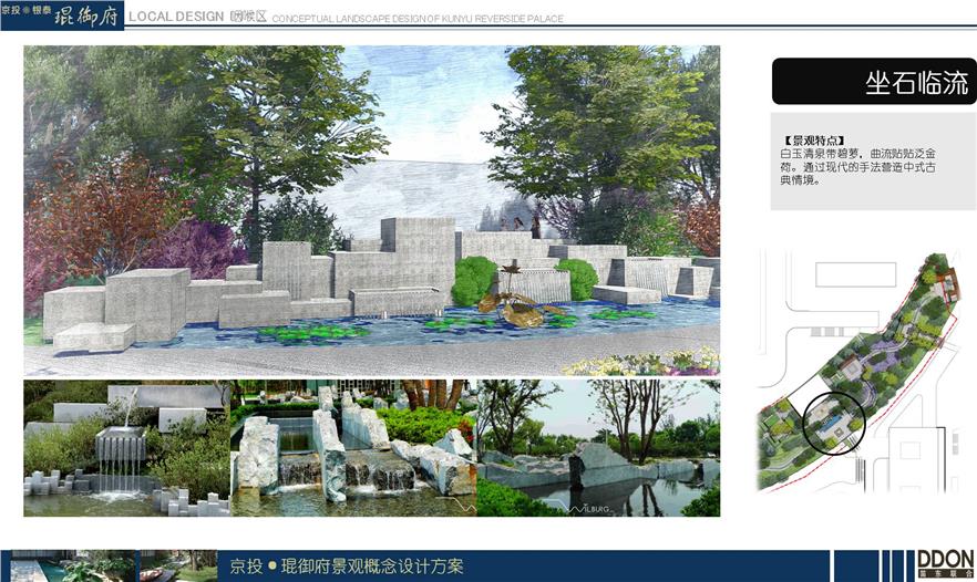 坐石臨流:白玉清泉帶碧蘿,曲流貼貼泛金荷。通過現(xiàn)代的手法營造古典情境。
