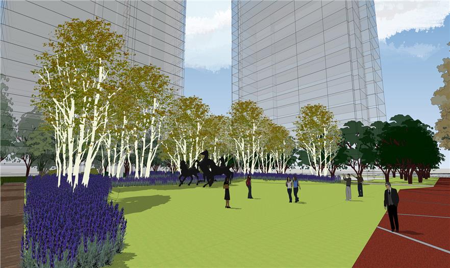 中心草坪--簡約的現(xiàn)代自然風格,結合白樺林和鼠尾草+駿馬的雕塑。 在南國地域中出現(xiàn)北國的樹林草地效果,給樓盤帶來獨特的色彩和主題。