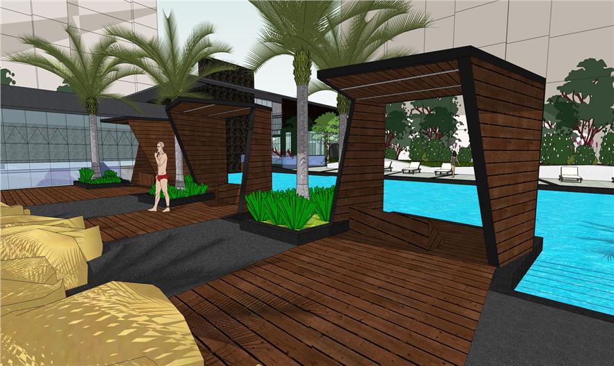 水吧 – 現(xiàn)代簡約的風格和售樓處建筑的木擱刪相呼應,大氣,精致同時在泳池處設立一個水吧或酒吧彰顯高端度假風情。