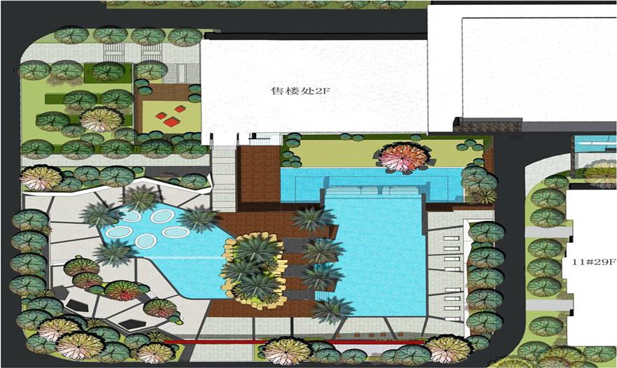 此區(qū)域植物的設計以邊緣圍合,中間圍繞泳池放開的手法,配合鄉(xiāng)土植物及熱帶植物(多選用多種名貴樹種),形成神秘、寧靜的感觀,達到熱帶度假酒店式釋放帶動精神的享受與聯(lián)想……