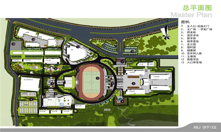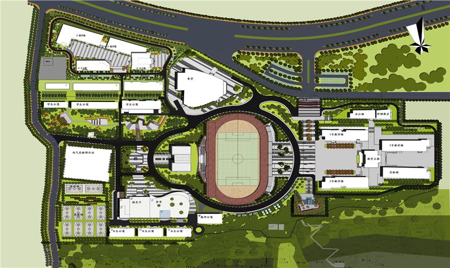 規(guī)劃采用環(huán)路的方式來構(gòu)建起校園的主要空間結(jié)構(gòu),分為主教學(xué)區(qū),運動區(qū),學(xué)生生活區(qū)三大區(qū)域,空間結(jié)構(gòu)較為明朗,建筑布局較合理。