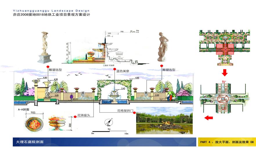 細(xì)節(jié)景觀(guān)設(shè)計(jì)結(jié)合建筑的圍合布局,以組團(tuán)綠地劃分基本空間體系,將凡爾賽宮苑恢弘大氣的皇家風(fēng)范、麥萊雅維勒花園寫(xiě)實(shí)性的田園風(fēng)景園林、香榭麗舍大道在城市空間渲染的氛圍融入到景觀(guān)當(dāng)中,濃縮其典型的特征和歷史人文風(fēng)范,創(chuàng)造出具有法式古典主義傾向的現(xiàn)代景觀(guān),華美再現(xiàn)17、18世紀(jì)法式皇家園林造園藝術(shù),使其既具有完善合理的現(xiàn)代先鋒辦公空間的使用功能,又不同于常見(jiàn)的法式開(kāi)放園林。