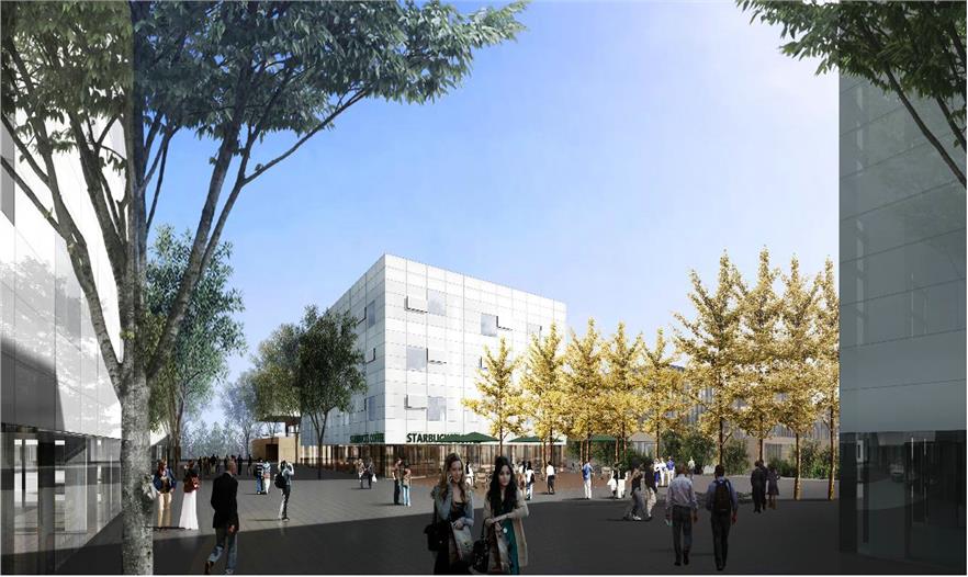 此外,建筑圍合的開放式廣場是景觀設(shè)計的重要節(jié)點,建筑A4#、A5#、A6#圍合的兩個區(qū)域,為商務(wù)休閑廣場,其中的景觀小品結(jié)合下沉空間,并從其形狀中提取元素做特色種植池兼座椅,使廣場形式統(tǒng)一,并具有形式美感和藝術(shù)情趣,借此提高商務(wù)空間的品質(zhì)感。建筑A3#、A4#間形成的廣場是通往下沉中央公園的重要節(jié)點,在景觀上采用了旱噴水景凝聚人氣,同時結(jié)合木鋪和銀杏樹陣,為休閑聚會、舉辦活動提供了良好的空間。