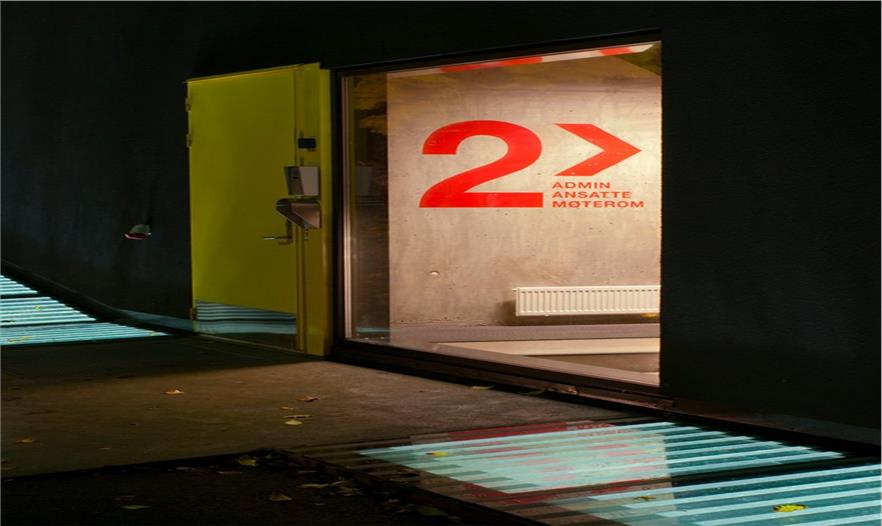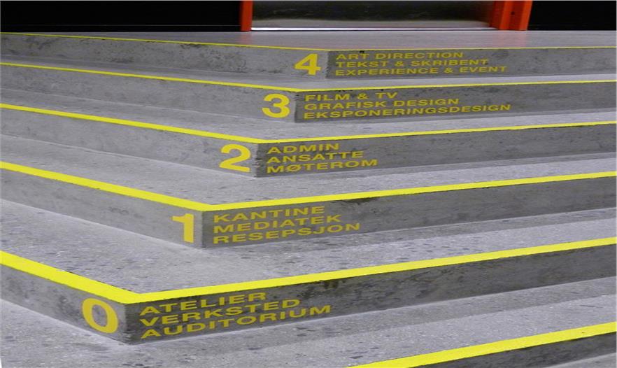 Westerdals學(xué)校導(dǎo)視設(shè)計。挪威Westerdals學(xué)校位于奧斯陸,這棟建筑給了以極強(qiáng)的工業(yè)感和強(qiáng)硬感,因此導(dǎo)視也為配合了這種風(fēng)格。設(shè)計者:Marius Holtmon。