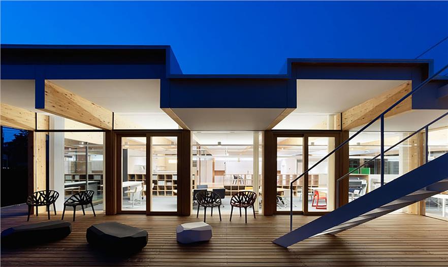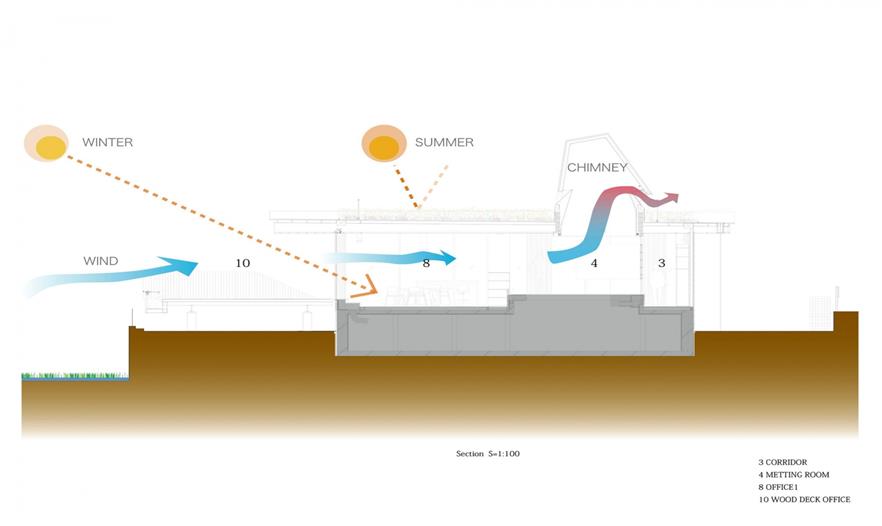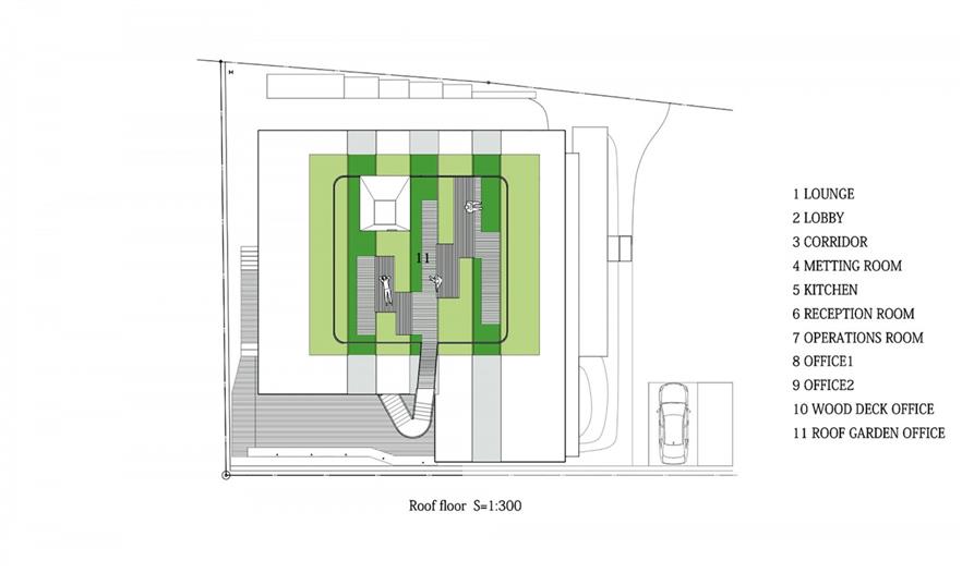 這個(gè)富有個(gè)性的DEN-EN辦公室是由AUAU設(shè)計(jì)的。作為一個(gè)工作場(chǎng)所,這里不僅是辦公空間,而且還有小資情調(diào)的室外空間和屋頂平臺(tái)。家具的布置,積累的信息以及對(duì)話激活了這個(gè)辦公場(chǎng)所,除了室內(nèi),室外也提供戶外辦公環(huán)境。為了營(yíng)造一個(gè)沒(méi)有隔墻的大房間,設(shè)計(jì)中采用了薄板狀的木材作為橫梁。這些木材產(chǎn)自愛(ài)知縣,還用于建筑外墻,具有自然親切的特征。剖面設(shè)計(jì)中充分考慮到通風(fēng)路徑,結(jié)合郊區(qū)氣候、景觀以及屋頂綠化等手段解決環(huán)境問(wèn)題。