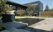 如園的建筑立面采用中國傳統(tǒng)建筑的經(jīng)典三段式,大屋頂、屋身和基座,而這當(dāng)中最為精華、最能體現(xiàn)中國傳統(tǒng)特質(zhì)的則是坡屋頂?!对娊?jīng)》有云:“如跂斯翼,如矢斯棘,如鳥斯革,如翚斯飛”。如園的屋頂正是由中國古建中的重檐頂提煉而來。其坡度平緩,上檐坡度18度,下檐坡度12度;出檐深遠(yuǎn),出挑墻面1.4米;上檐直線與曲線巧妙結(jié)合,成向上微翹的飛檐,不但在功能上增大了10層的采光面積,利于排水,外觀上更為輕盈。