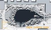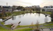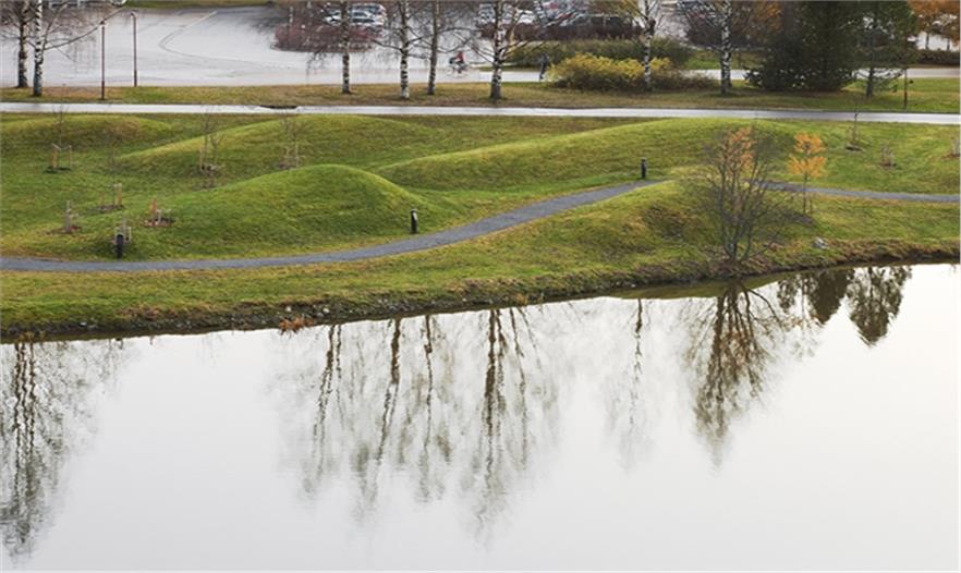 于默奧大學(xué)的新公園校區(qū)面積共23000平方米,陽光甲板、休閑碼頭、開放式草坪、步道和露臺圍繞著中心的人工湖。湖的一端有一座小島,島上有一座小橋通向南岸。在這里能欣賞到丘陵式的綠色景觀、或明或暗的“山谷”和點綴其間的白樺樹。