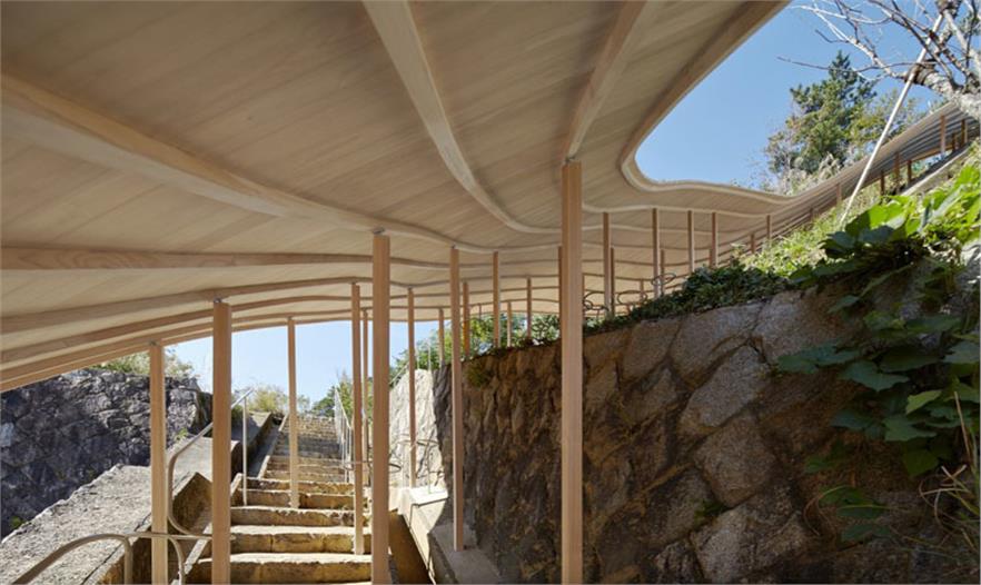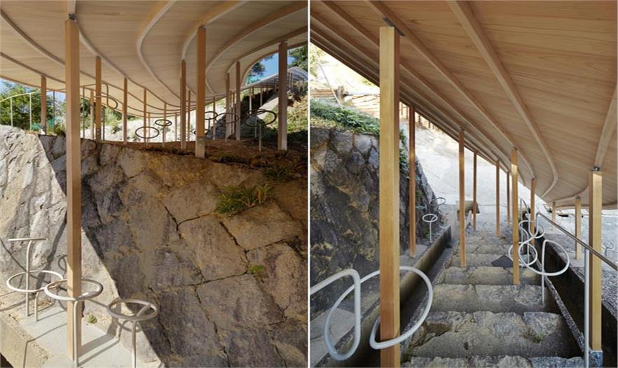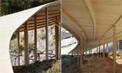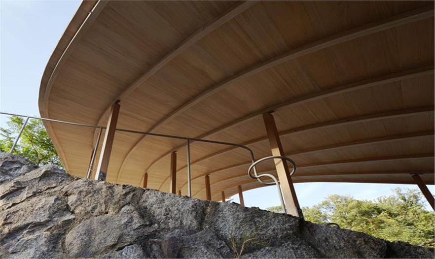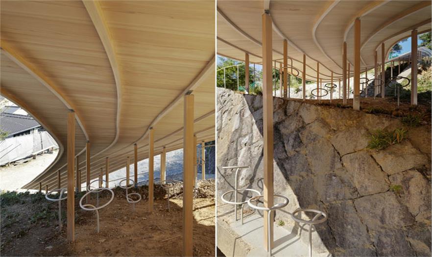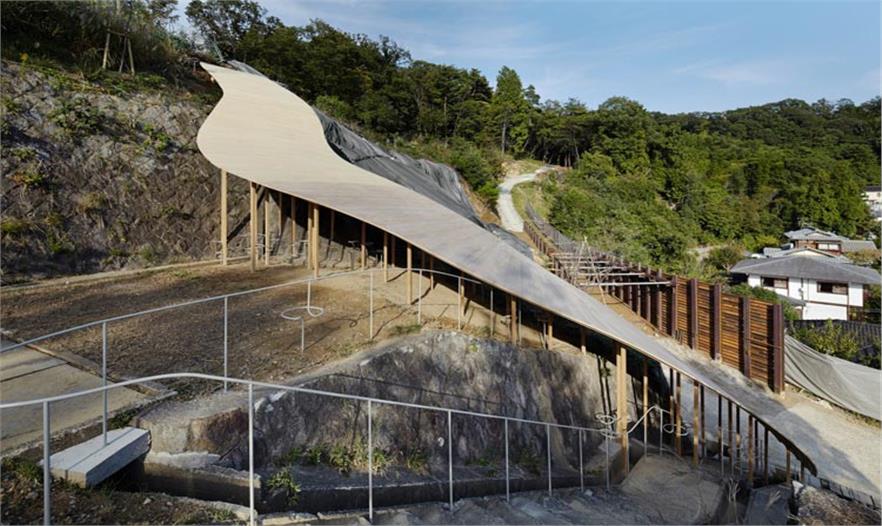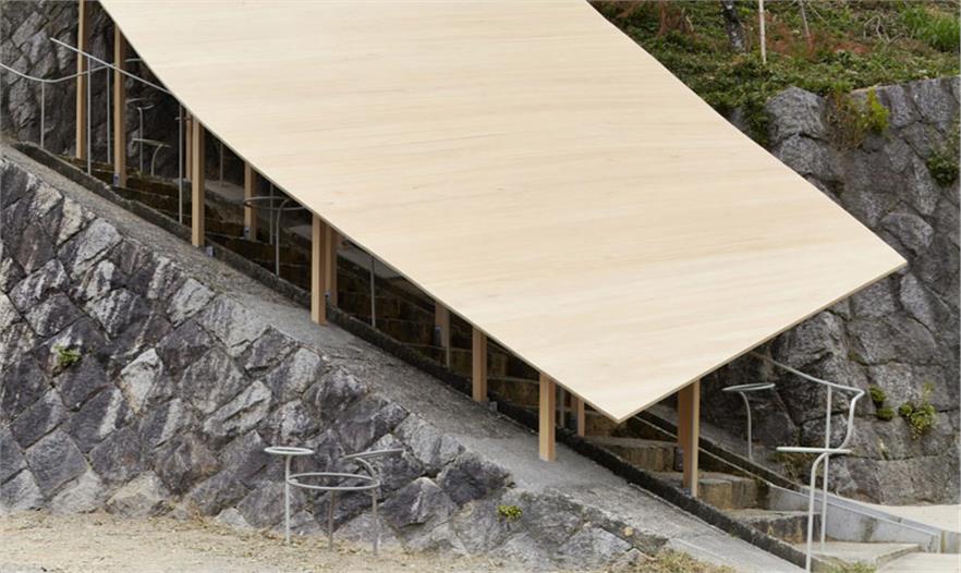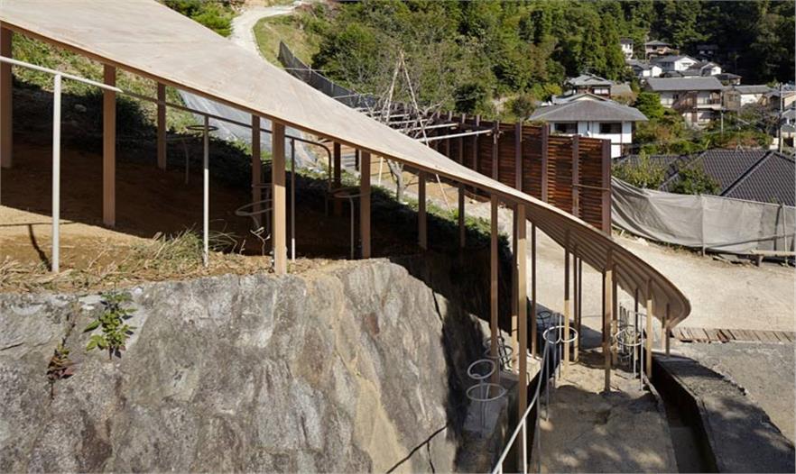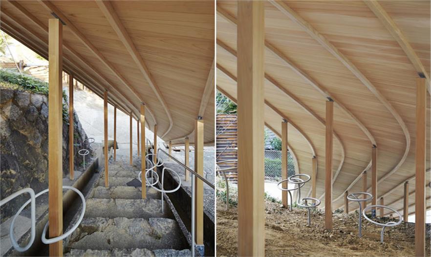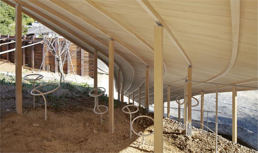 建筑所在位置是一個(gè)草木茂密的小山坡,在晴朗的日子,這里幾乎能數(shù)出京都東部山脈綿延的36個(gè)山峰。相鄰區(qū)域?qū)⒈灰?guī)劃為一片李子果林,在早春花季這里將成為一處氣味芳香的美景。西澤立衛(wèi)用一個(gè)連貫的屋頂將這些元素納入到整個(gè)設(shè)計(jì)中。屋頂精巧的依據(jù)地勢(shì)傾斜,仿佛向下流動(dòng)的溪水。既是屋頂又像一道“屏障”,roof and mashrooms 的空間體驗(yàn)就是要喚起游客漫步在山間茂盛樹冠之下的感覺。
