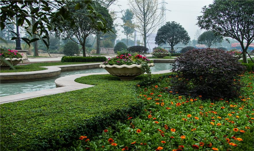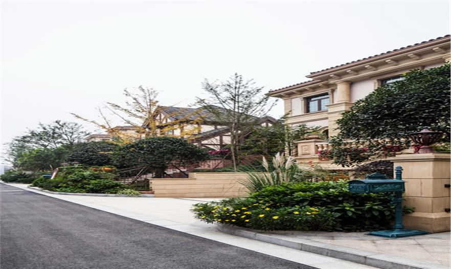 克里特島主要由聯(lián)排、雙拼建筑類型組成。島內(nèi)建筑間距相對較小,聯(lián)排建筑的停車方式均為室外停車,入戶空間相對較小,在顧全以上限制因素的條件下,設(shè)計(jì)師以“盛花”為主題進(jìn)行景觀設(shè)計(jì),點(diǎn)綴種植高大喬木。用數(shù)棵“藍(lán)花楹”構(gòu)筑場地空間,結(jié)合建筑布局和建筑入戶空間,以層次豐富的四時(shí)花境形成主要植物景象,營造出鮮花盛開,親切自然的庭院氛圍。