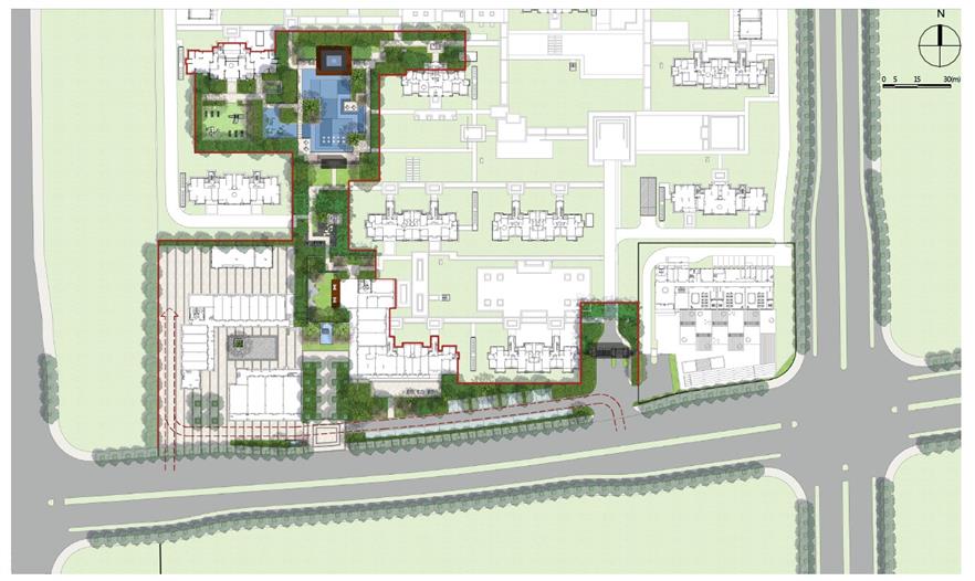 本案建筑由20棟高層住宅,1組商業(yè)群和1所幼兒園,以及一個(gè)地下汽車(chē)庫(kù)組成。住宅建筑使用上為商品住房。建筑設(shè)計(jì)風(fēng)格為新中式風(fēng)格----大氣、沉穩(wěn)、高貴。商業(yè)布局沿南側(cè)市政道路布置,并結(jié)合住宅社區(qū)出入口,形成內(nèi)向型商業(yè)廣場(chǎng),使地塊商業(yè)價(jià)值最大化,并為住戶(hù)提供了生活便利性。