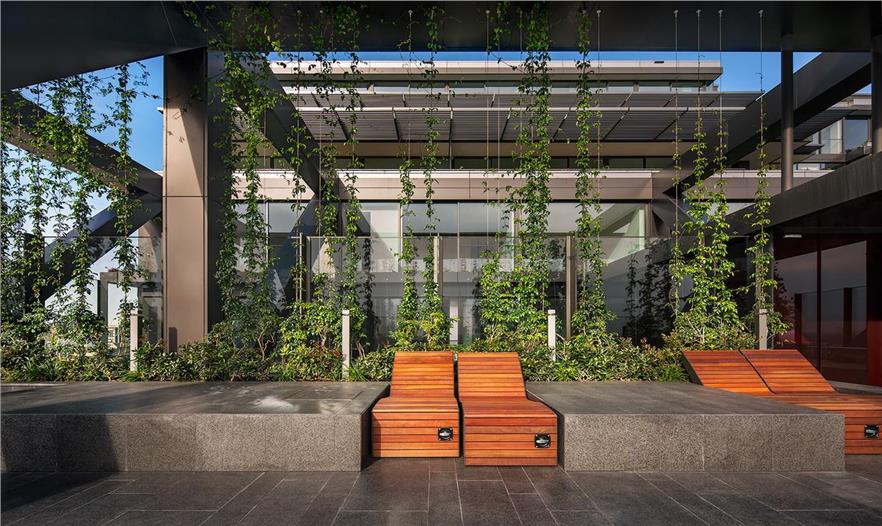 各類植物包裹著建筑,這些綠色的植生墻好像是周圍的綠地延伸上來一樣。