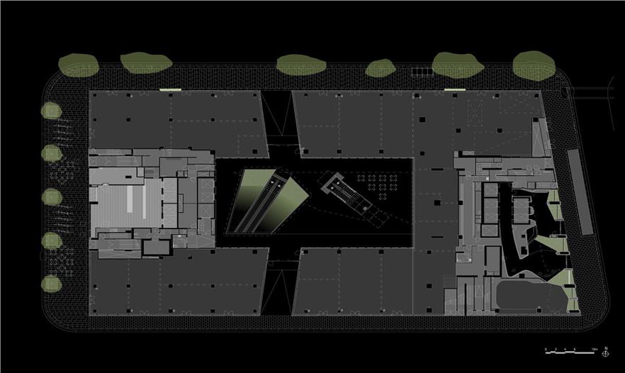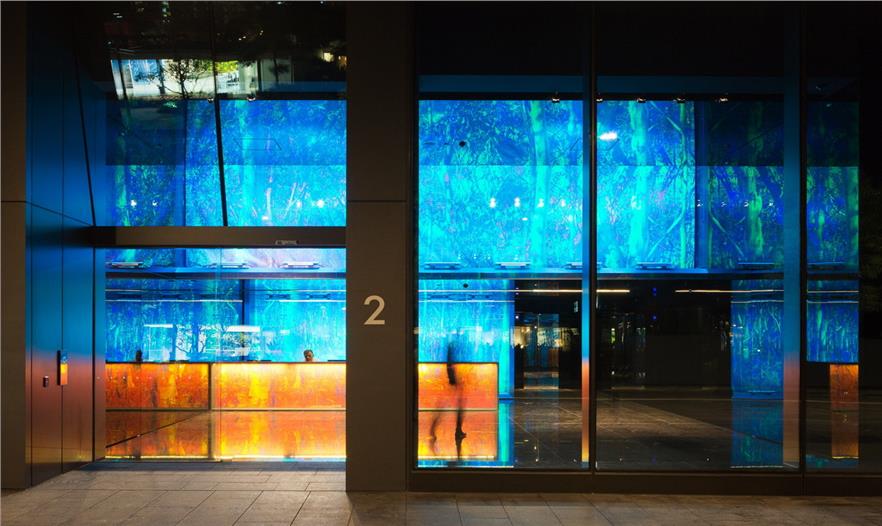“中央花園”東側(cè)塔樓處最有特色的是有一個(gè)懸臂式的反射裝置,即日光反射裝置。該裝置由320個(gè)固定的、機(jī)動(dòng)化的紅外線鑲嵌板組成,用來將太陽光折射到區(qū)域內(nèi)任何一個(gè)被陰影覆蓋的地方。到了晚上,日光反射裝置變成一個(gè)非常現(xiàn)代化的吊燈,好像一個(gè)池子懸浮在夜空中,其中LED燈光閃爍好像依然在反射日光,塔樓呈現(xiàn)出色彩斑斕的夢(mèng)幻景象。