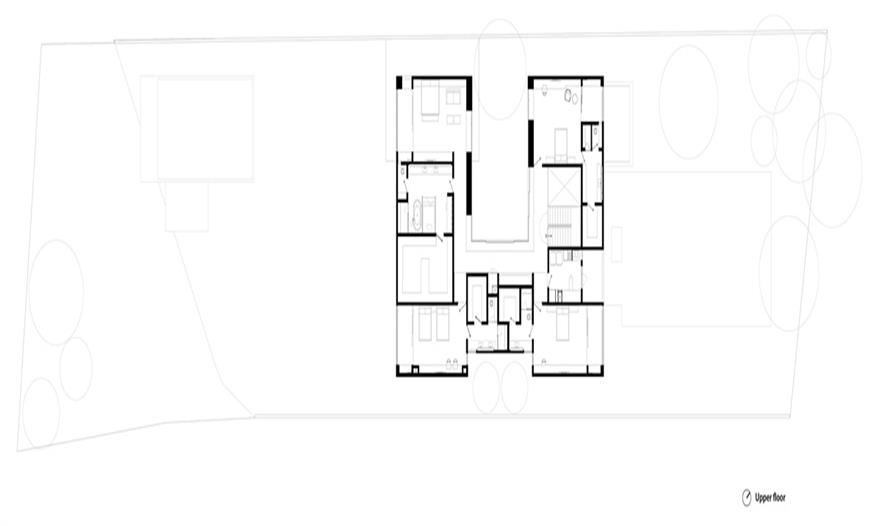 該建筑的入口成序列設(shè)計(jì),形成了一系列連貫的空間層次,從收進(jìn)線外的花園空間開(kāi)始,接著是經(jīng)過(guò)池塘的開(kāi)放型走廊,一路穿過(guò)中央庭院,直到主體建筑后的生活空間。