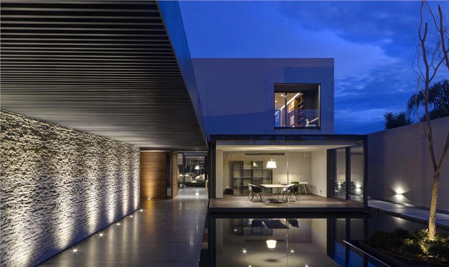 建筑的主入口通向一條穿過(guò)粗糙石墻的開(kāi)放式通道,將進(jìn)入住宅的步行距離拉長(zhǎng)了幾米。玻璃的工作室向外凸出于建筑,懸浮在一大片的水池之上。池塘上的鋪石汀步可以直接進(jìn)入住宅的公共區(qū)域。車庫(kù)隱匿在石墻的另一邊,也設(shè)了停車庫(kù)專用車道,讓人們從任何地方都看不到停放汽車的地方,從而不會(huì)影響建筑內(nèi)任何空間的視覺(jué)景觀。