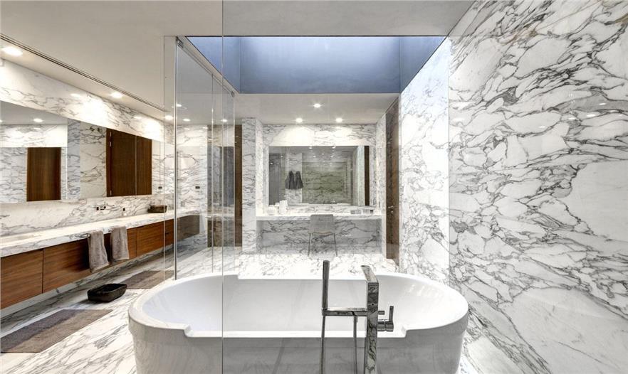 深灰色的鋼材、玻璃、木材、混凝土和石頭等材料,形成住宅空間豐富的層次。少數(shù)地方由皮革和不銹鋼作為補(bǔ)充。主浴室顯得尤為特殊,因?yàn)樗鼛缀跞坑砂咨罄硎采w。