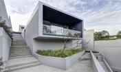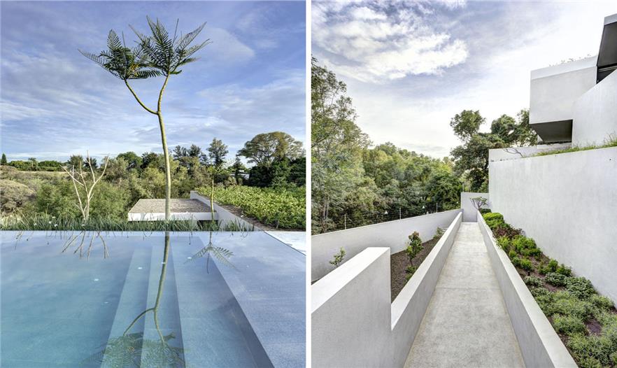 穿過(guò)草坪,在一層的生活空間的另一邊,是一個(gè)游泳池和能夠眺望戶外山谷景觀的混凝土的娛樂(lè)空間?;顒?dòng)室下方有交錯(cuò)的小道通向地勢(shì)較低的景觀區(qū),小道逐級(jí)下沉以適應(yīng)巖石地形的變化。