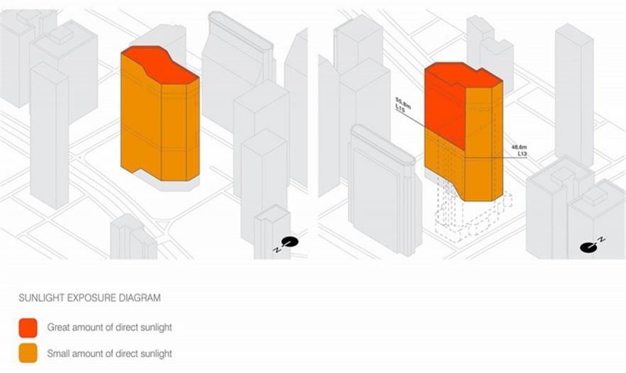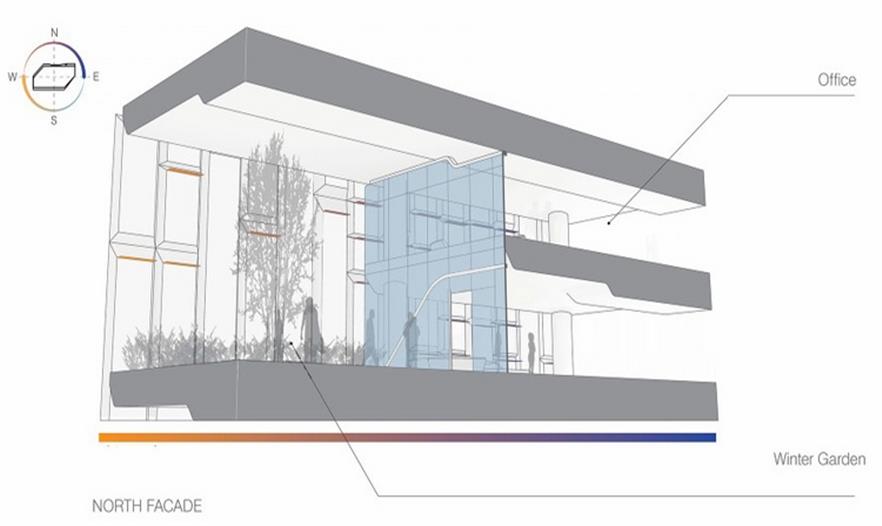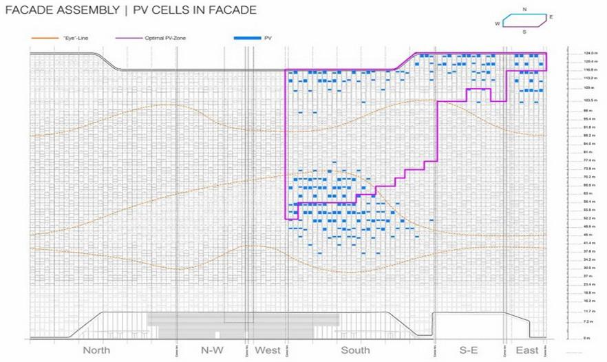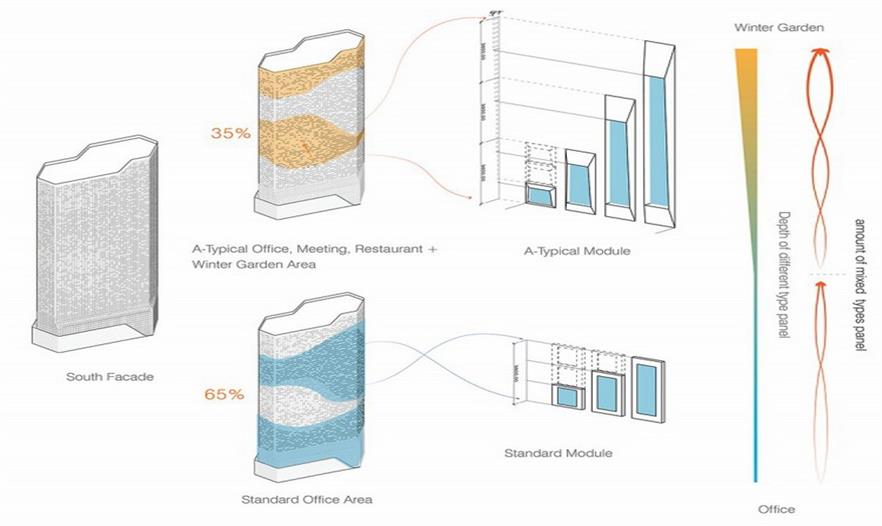 太陽和建筑方位決定了立面幾何,保證了用戶舒適度,減少了能源消耗。玻璃角度經(jīng)過調(diào)整偏離直射太陽光線,減少了直接的太陽能影響,而南立面上層部分的角度則適合接收直射光線。