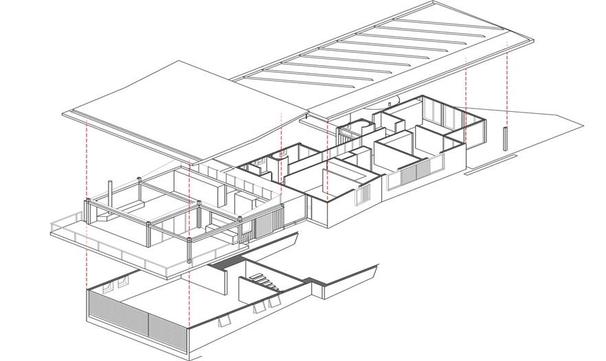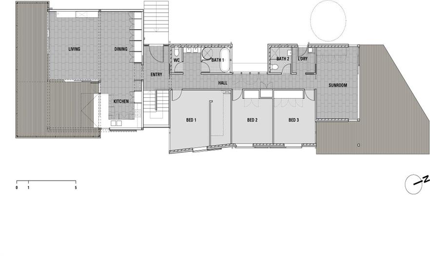 這個(gè)房屋分成3個(gè)獨(dú)立區(qū)域;后面的日光浴室,臥室和過(guò)道以及前面的起居空間。這些有助于在冬天儲(chǔ)存熱量。整個(gè)房屋保持著對(duì)流通風(fēng)。前面的起居空間通過(guò)屋頂和墻上一系列的百葉窗通風(fēng)。臥室也通過(guò)門上的楣窗進(jìn)行對(duì)流通風(fēng)。