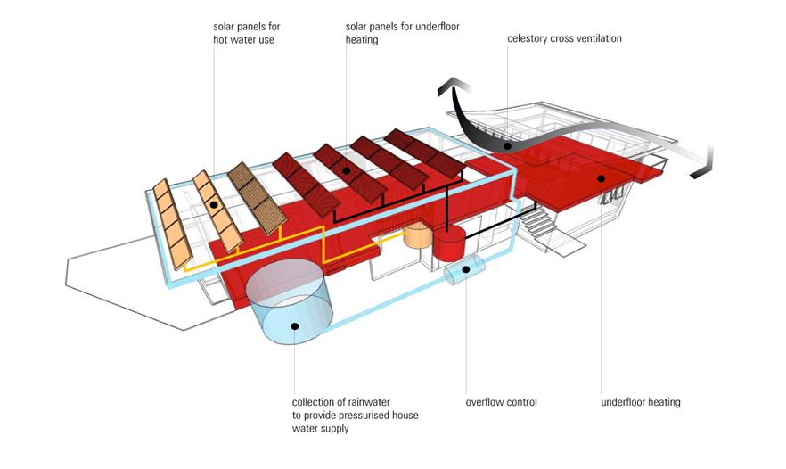 其他的可持續(xù)策略包括一個(gè)1.5萬(wàn)L的雨水儲(chǔ)存罐,結(jié)合了廢水回收系統(tǒng),最小化耗水量,并為供熱和熱水供應(yīng)使用真空管以及使用光伏太陽(yáng)板把電力返還給電網(wǎng)。