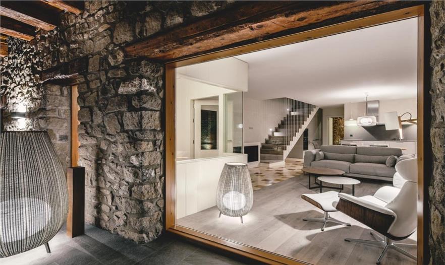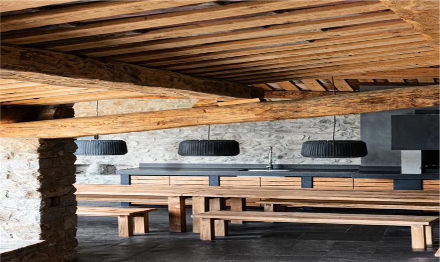 在室內(nèi),房間和待客區(qū)保留了現(xiàn)有的石頭墻,而地板、瓦片、木制品和鐵制品的結(jié)合讓房屋顯得更加開闊。人們能從許多房間里欣賞到戶外壯觀的景色,而這些景色與室內(nèi)設(shè)計結(jié)合,得到了自然過渡。