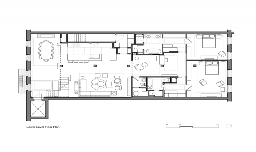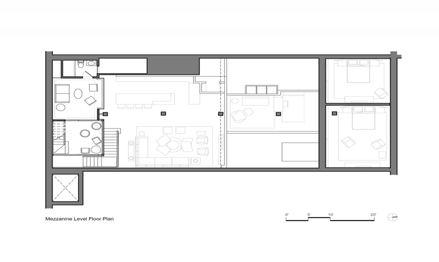 在曼哈頓地標(biāo)性的特里貝克地區(qū)北部,一個(gè)建于1884年的魚(yú)子醬倉(cāng)庫(kù)3000平方英尺的頂層和屋頂被改造成一個(gè)住宅,其有著寬敞、開(kāi)放的休閑區(qū),并與室外環(huán)境有著流動(dòng)性的聯(lián)系。室外聯(lián)系 住宅置入了一個(gè)夾層,打造了一個(gè)擁有可伸縮玻璃屋頂?shù)氖覂?nèi)下沉庭院,同時(shí)與其上方的綠化屋頂花園相連接。通過(guò)這種方式,減少內(nèi)部空間使用的體塊,將室外環(huán)境帶進(jìn)了主起居空間。揭開(kāi)屋頂,室內(nèi)空間沐浴在陽(yáng)光中;進(jìn)一步打開(kāi)屋頂,充足的空氣進(jìn)入到這個(gè)曾經(jīng)通風(fēng)不良、空間陰暗的閣樓里。到了晚上,這個(gè)庭院又轉(zhuǎn)變成了一個(gè)室內(nèi)的燈籠,照亮了下方的閣樓。