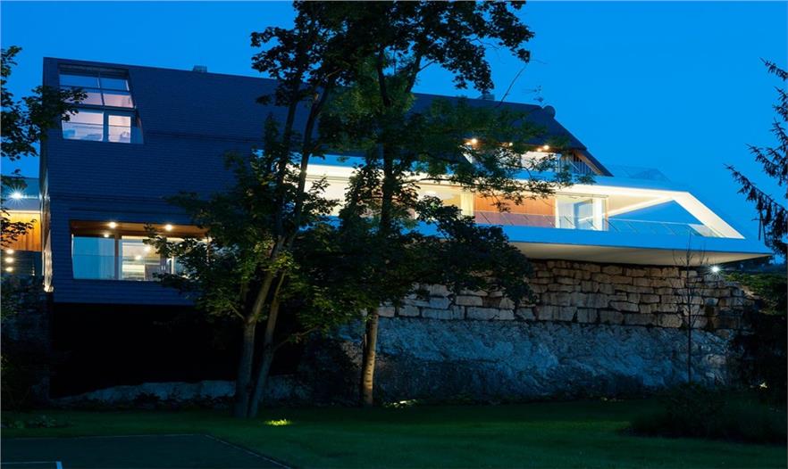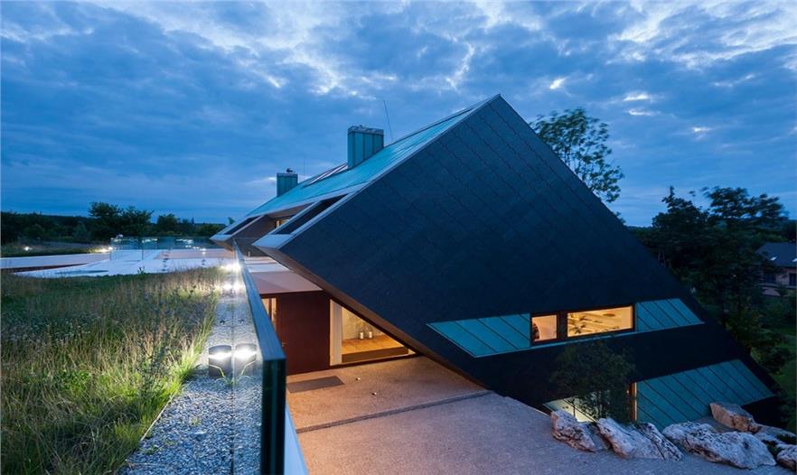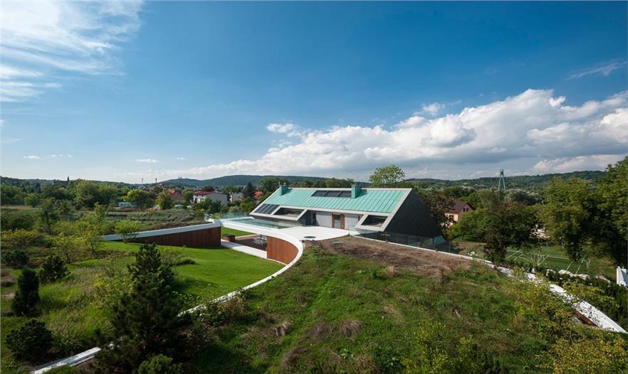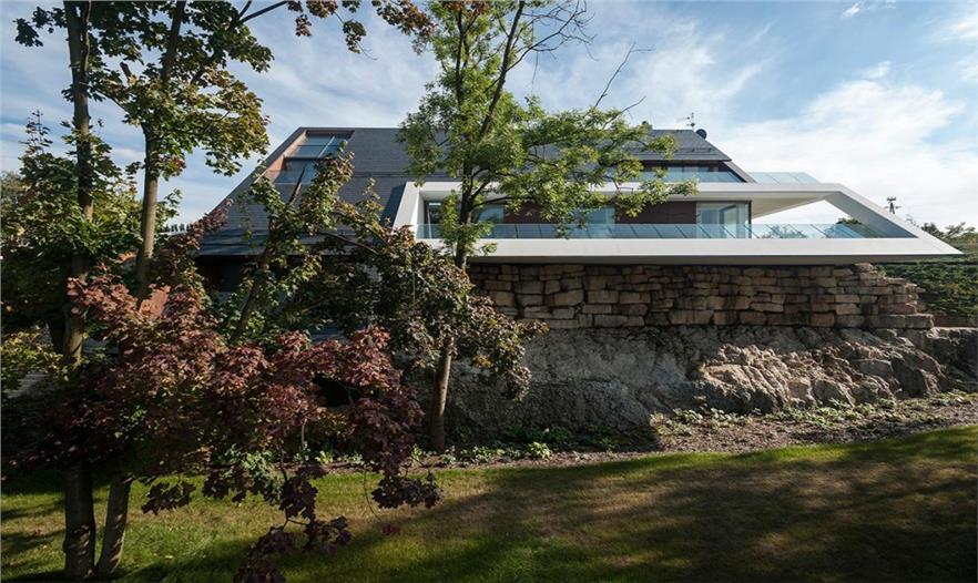 這座房屋在當(dāng)?shù)厥莻€(gè)例外——一個(gè)傾斜的框架能觀賞到克拉科夫周邊的山景,被一個(gè)8米長(zhǎng)的石灰?guī)r切割成兩部分。