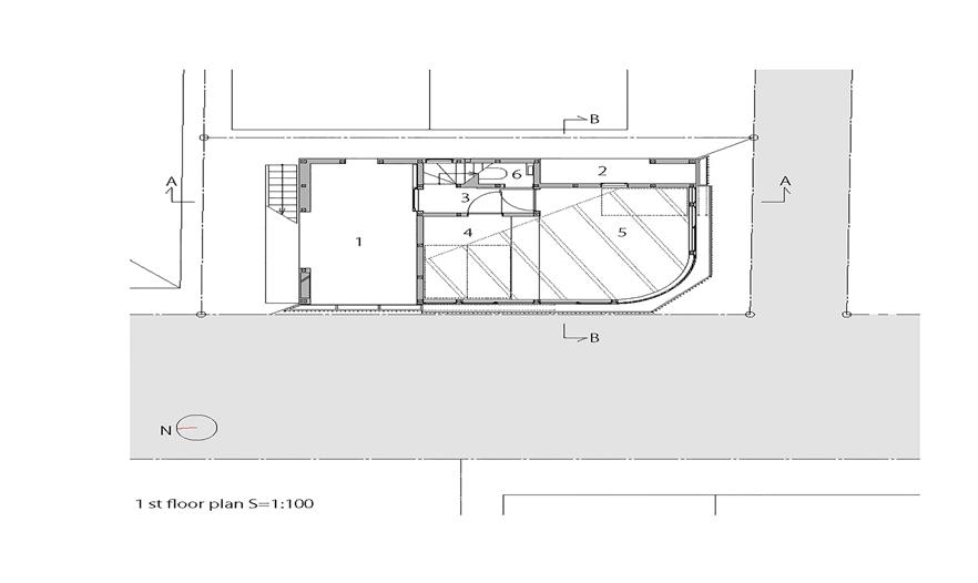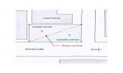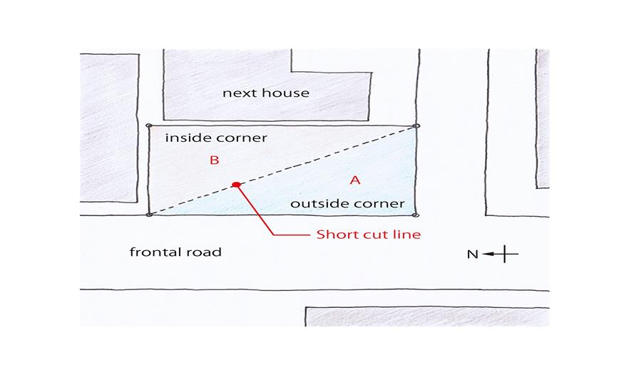 住宅的A型部分和B型部分旨在適應(yīng)外拐角與內(nèi)拐角的周邊環(huán)境,并等分斜交在一起。當(dāng)轉(zhuǎn)角地段是空置的,行人斜穿過場地,分割出兩部分。這條切割場地為兩部分的路徑似乎很適合用來作為兩部分不同住宅的交接線。