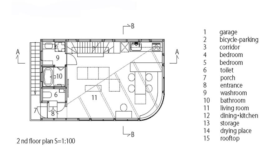 這座住宅由A和B兩個不同類型的部分等量組合而成。