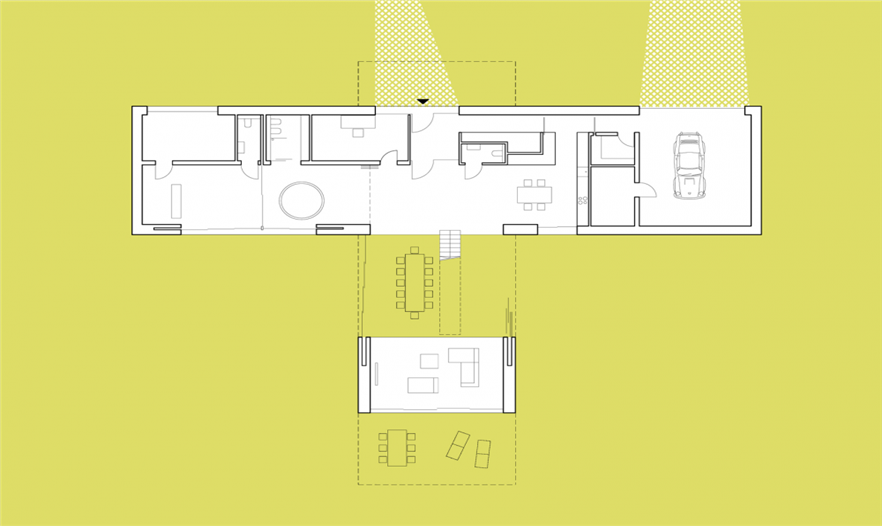 位于懸挑突出部分底下的花園起居空間使用不同的材料,強(qiáng)調(diào)與自然的融合。地板如同草地,室外的玻璃隔板,由SKY FRAME公司提供,可以整個(gè)拆除并收藏在墻壁內(nèi)龕里。