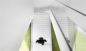 首層和二層的室內(nèi)裝飾使用白色。地板由聚氨酯樹脂制作,還有,墻面和家具表面都采用漆面光澤的MDF板。