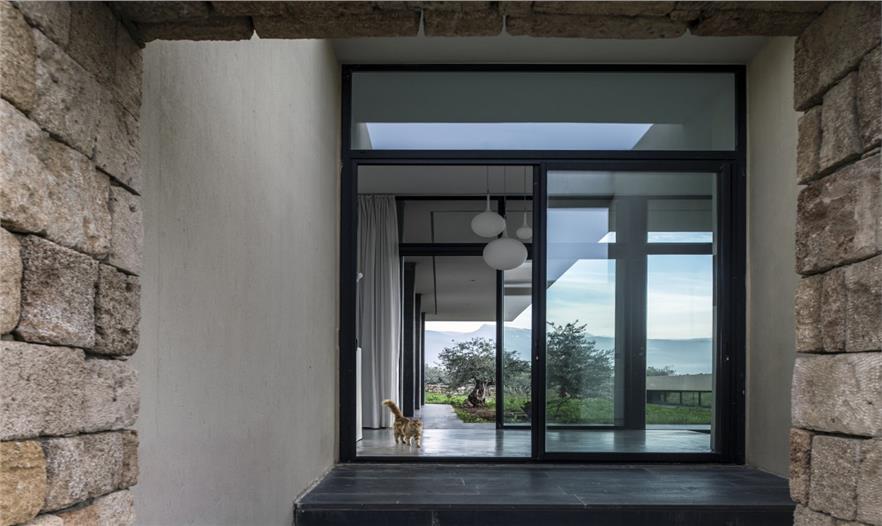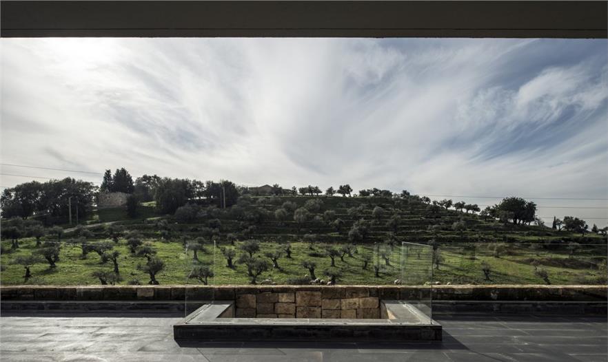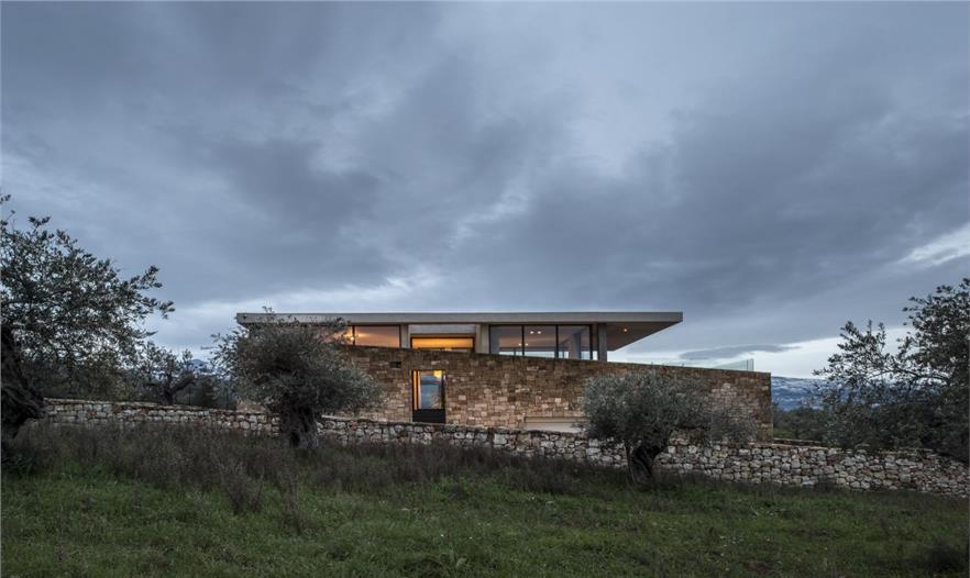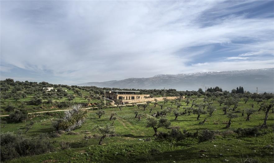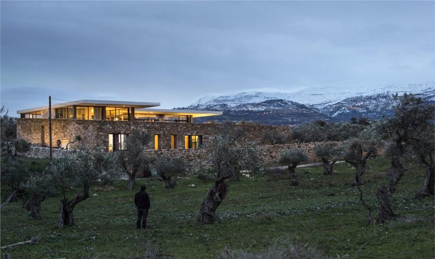 茲加爾塔(Zgharta)住宅坐落于一處地中海的橄欖林美景之中。場(chǎng)地通過很緩的坡度與主路相連,并且將開闊的平原和山脈美景盡收眼底。兩個(gè)L型的水平體塊順應(yīng)了自然地勢(shì),解決了地形、景觀視野和私密性的問題;底層包含了臥室、浴室和設(shè)備區(qū),上層則設(shè)置了主要起居空間、餐廳、廚房和圖書室。