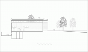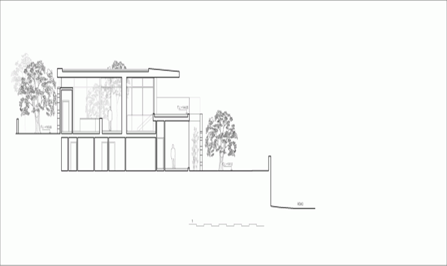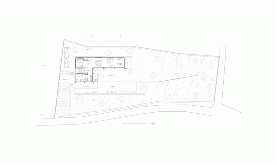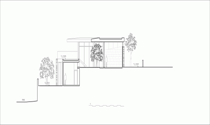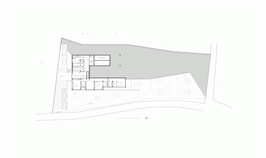 從街道角度看過來,建筑就如同一系列水平向的輪廓剪影,逐漸消失在土地之中,在保證了沿街方向的私密性的同時(shí),將住宅融入到了周邊地形之中。