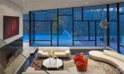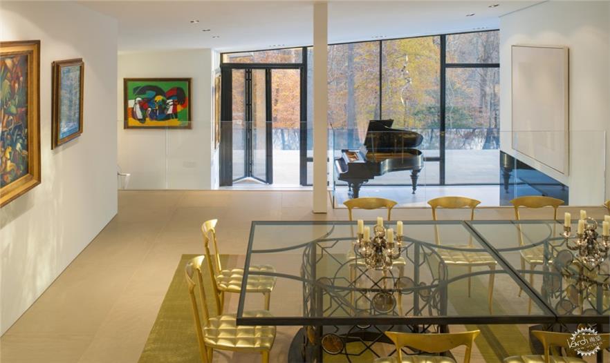 現(xiàn)有的主結構建于 1965 年,在一個單一緩慢傾斜的屋頂與山脊線橫跨沿對角線上方的正交排列的空間下有一系列內外空間。一個附加的六角形空間內有臥室??臻g被柔和色調的材料包裹著,包括黑石板地板,灰色的石頭墻和壁爐,還有黑色的木墻和天花板。除了大片的玻璃幕墻,室內被劃分出比較暗的空間。在翻新主屋方面,設計師放棄了所有的室內裝飾,圍墻被拆, 空間被打開, 窗戶被放大和替換,以此達到反射光線的目的。該項目在現(xiàn)有屋頂的基礎上還有一些小的增建。雖然保留了屋蓋結構,但是碎石鋪砌的房頂替換成常規(guī)屋頂,利用了鉛錫鍍不銹鋼材料。此外,頂板與壓條邊被干式堆積的板巖、 灰泥和石灰石混合材料取代。新的窗戶由定制的鋼幕墻和薄的塑鋼組成。室內裝飾包括寒武紀的奶白色石材和黑色的染色橡木地板,煙熏橡木、 胡桃木、 文革漆細木工制品、 玻璃、 磨礪、 拋光,錘絕對的黑色花崗巖。細節(jié)精致,沒有裝飾、包裝或踢腳板。