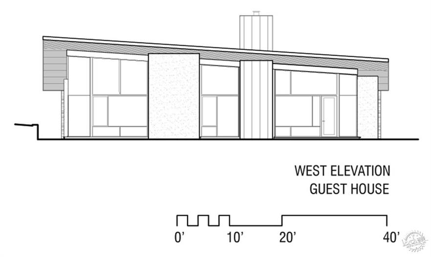 新車庫能容納三輛汽車,賓館包括兩間臥室。體量和材料的應用延續(xù)了主屋的風格。