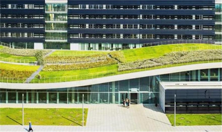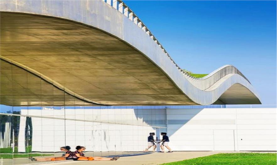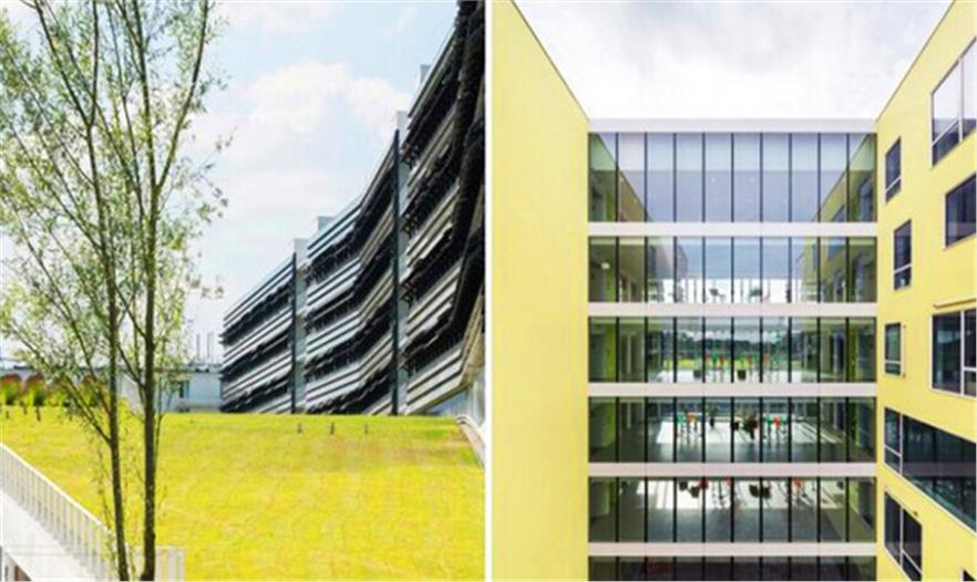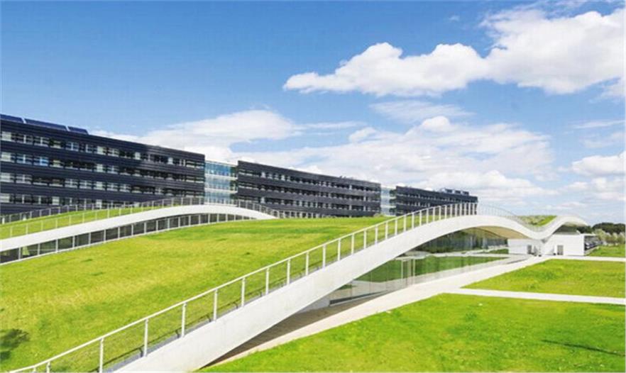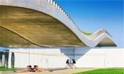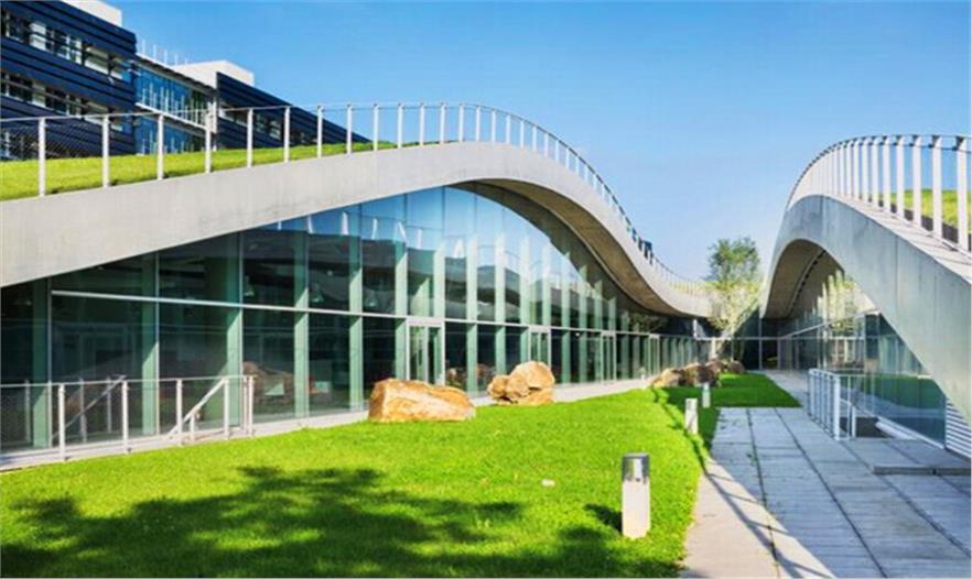 該設(shè)計(jì)的特點(diǎn)從其“景觀波浪”(landscape wave)的稱號(hào)中就能可窺一斑,其波浪起伏的混凝土屋頂上有著大面積的綠化區(qū)。建筑采用了常在橋梁建設(shè)中使用的拱形結(jié)構(gòu)技術(shù),并恰當(dāng)?shù)卦O(shè)計(jì)了一個(gè)大的混凝土實(shí)驗(yàn)室。這個(gè)可達(dá)的綠色屋頂不僅為校園提供了室外的休閑空間,同時(shí)也強(qiáng)化了周圍的結(jié)構(gòu),整合了方案的整體性。