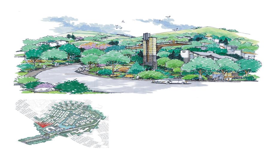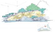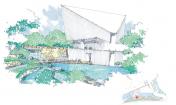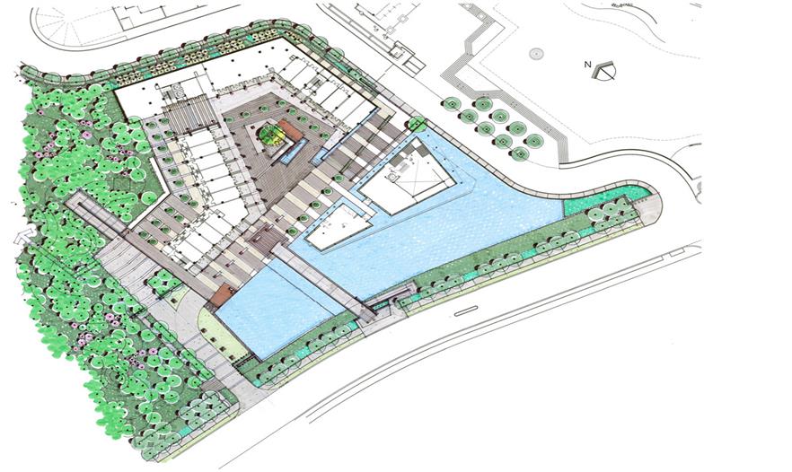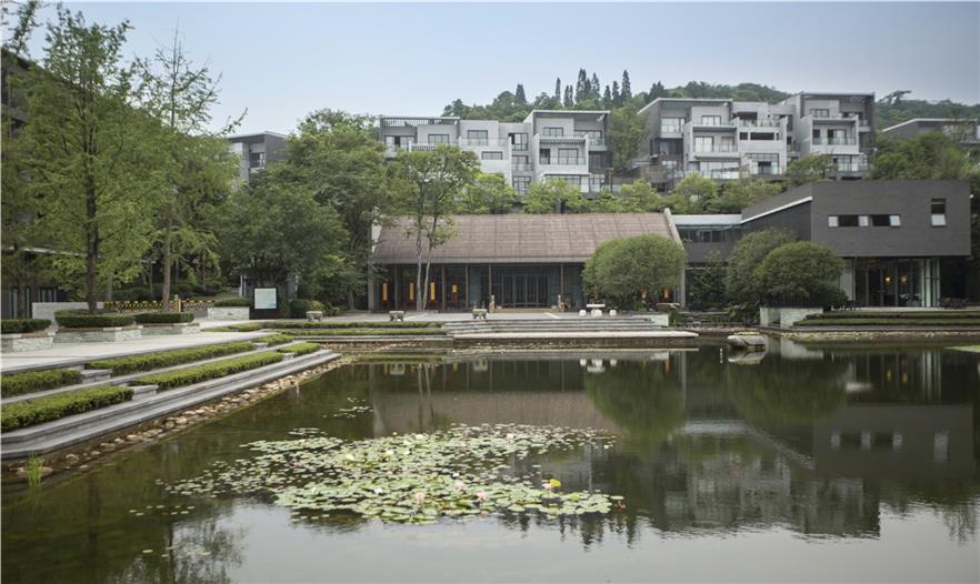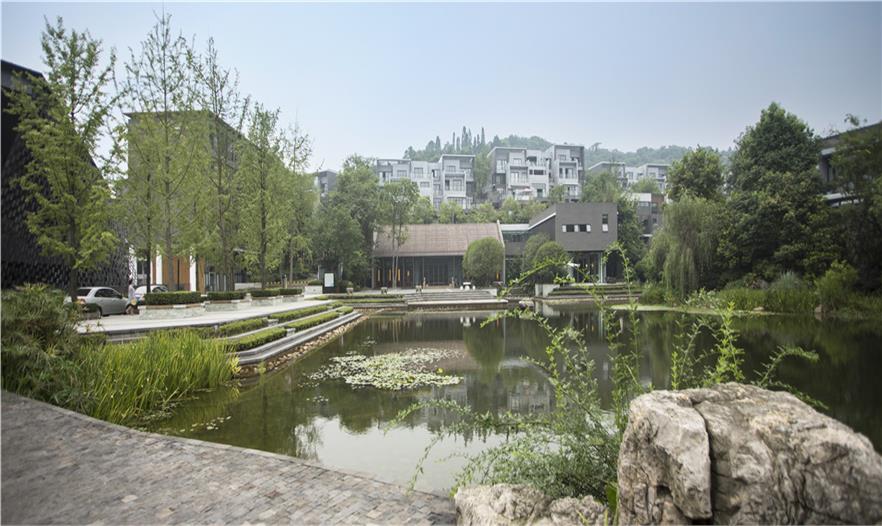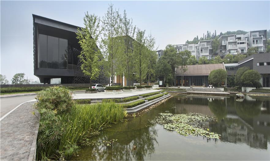 The project is situated in the gentle hill side ridges. Ringed on three sides by mountains with a rich variety of trees and water resources. The buildings are laid out in a radial technique, to fully utilize the advantages of the site. The landscape design is focused on the nucleus waterscape zone, which radiates in the axis to connect with the mountain landscapes.