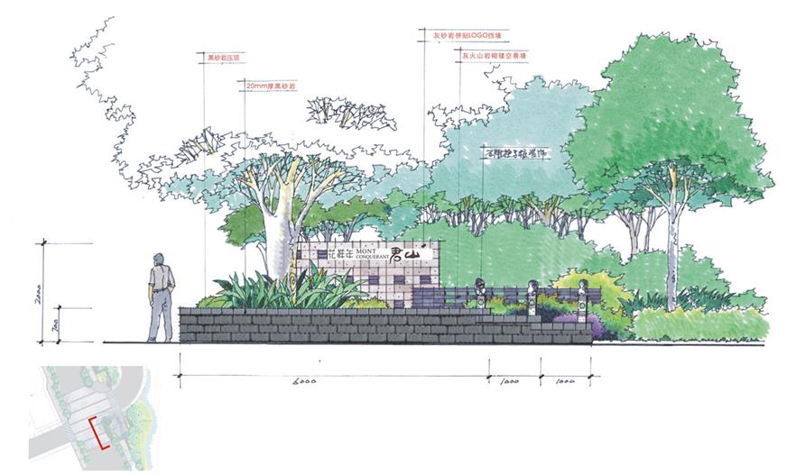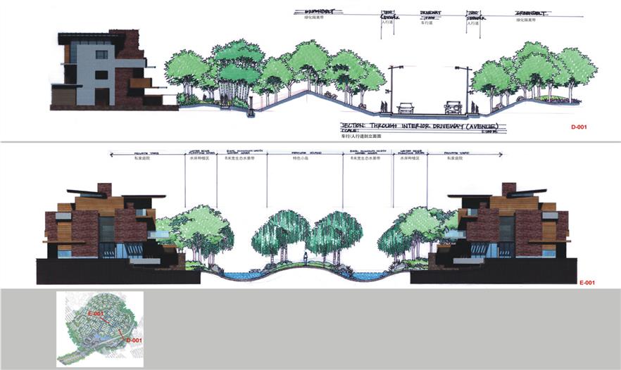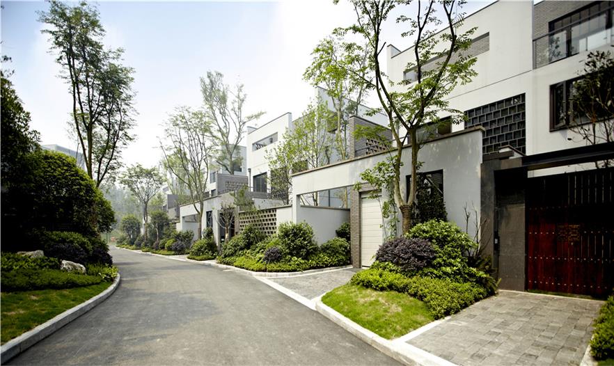 In the design process, the entire landscapes of the project are divided into functional landscape zone, nucleus waterscape zone, mountain landscape zone and mountain landscape zone between houses, and an interconnecting landscape zone.