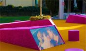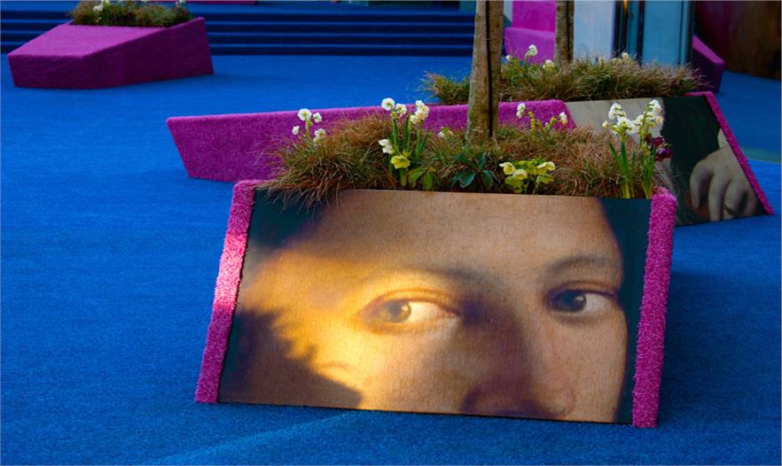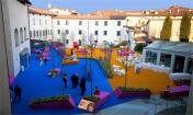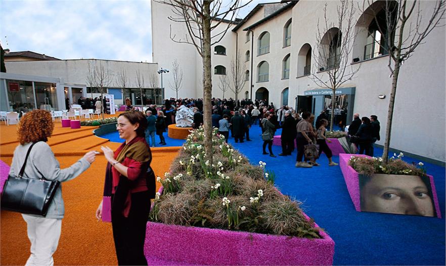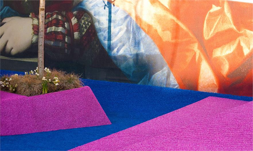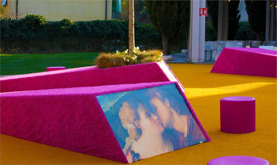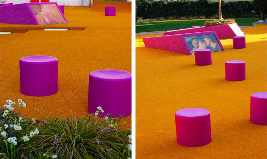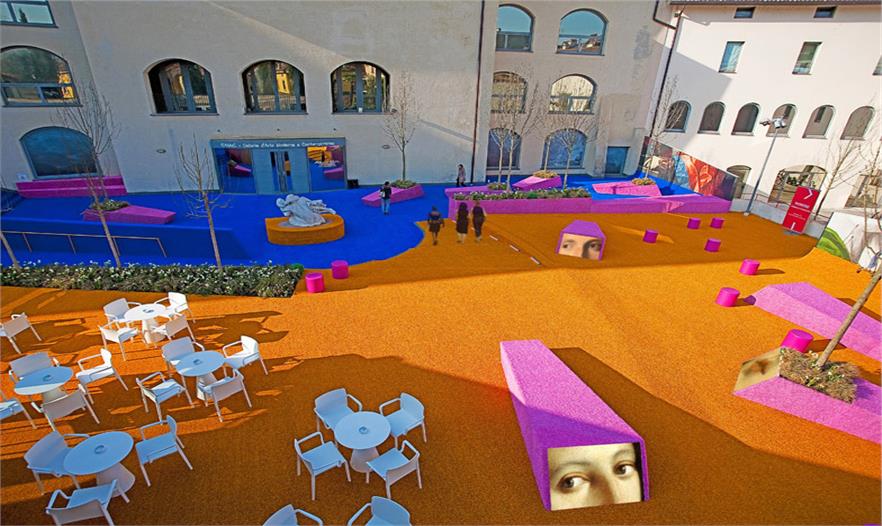 芬克工作室為意大利藝術(shù)博物館設(shè)計了一個五彩斑斕的靚麗庭院,鋪裝的人工草皮沒有選擇傳統(tǒng)的綠色,而是混搭了各種鮮亮的色彩,看上去非常具有潮范兒,又讓人心情愉悅。庭院里還放置了一些粉色形狀不規(guī)則的長方體,其中較大的一頭裝飾有文藝復(fù)興時期的畫作(不完整,選取了畫作的一部分)。這些長方體有的中間還種著樹木或花草,有的直接可以作為休憩用的座椅。這個庭院主要用于意大利威尼斯畫派著名畫家帕爾馬•伊爾•韋基奧的畫作展覽。他的人物造型豐艷,注重人物形象和自然環(huán)境的和諧處理,是威尼斯文藝復(fù)興繪畫初期的代表之一。庭院在改造之前,盡是“無情而慘淡”的混凝土,在彼得•芬克的帶領(lǐng)下,變成了一道鮮艷的風(fēng)景線。芬克希望創(chuàng)造一個空間,供游客在展覽參觀前后可以交流互動。這么靚麗的庭院想必坐著也是一種享受吧~庭院總體上采用了橙色和藍(lán)色。粉色的座椅點綴其間。