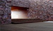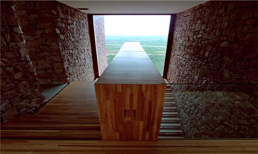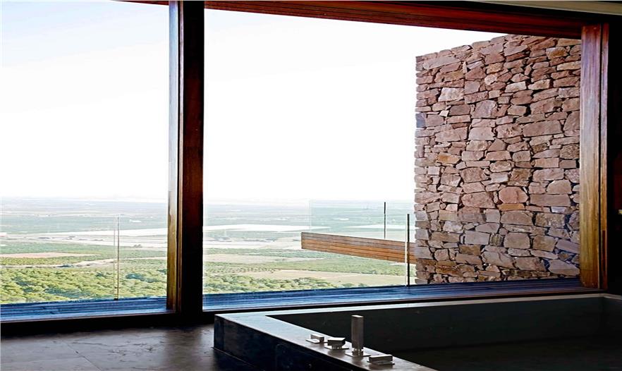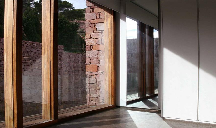 大面積的玻璃嵌入石墻,住戶可將遠(yuǎn)處山體和山谷的景色盡收眼底,同時(shí)通過(guò)玻璃的通透襯托石材砌體墻的厚重感。