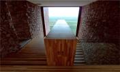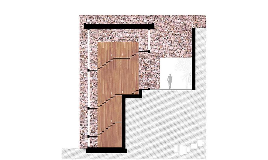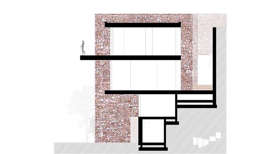 相反,住宅的西立面受限于空間的私密性,以分隔山體和住宅為主。石墻作為承重結(jié)構(gòu),并在住宅中間圍合了一個(gè)庭院,充當(dāng)住宅與周圍景觀的緩沖。這個(gè)外部空間連接舊宅與擴(kuò)建部分,作為戶主的藝術(shù)展廳。正因如此,住宅私密性最強(qiáng)的地方和它的配套服務(wù)設(shè)施都在這個(gè)區(qū)域。
